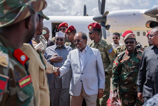 Apr 03-(Jowhar)- Madaxweynaha Jamhuuriyadda Federaalka Soomaaliya, Mudane Xasan Sheekh Maxamuud iyo wafdi uu hoggaaminayo ayaa maanta gaaray magaalada Baydhabo ee Xarunta KMG ah ee Dowlad Goboleedka Koonfur Galbeed,