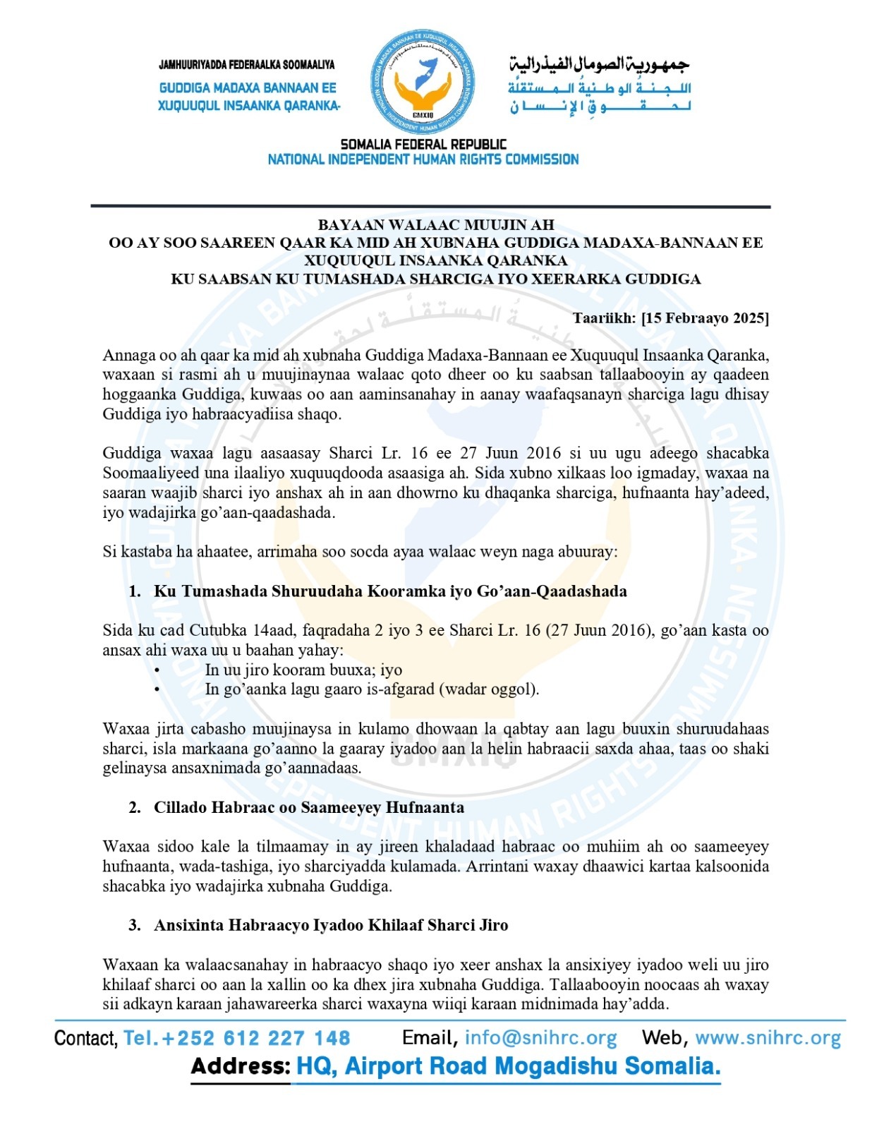 Feb 15(Jowhar)-Qaar ka mid ah xubnaha Guddiga Madaxa-Bannaan ee Xuquuqul Insaanka Qaranka ayaa soo saaray bayaan walaac muujinaya oo ku saabsan tallaabooyin ay sheegeen in ay ka hor imanayaan sharciga iyo xeerarka u degsan guddiga.