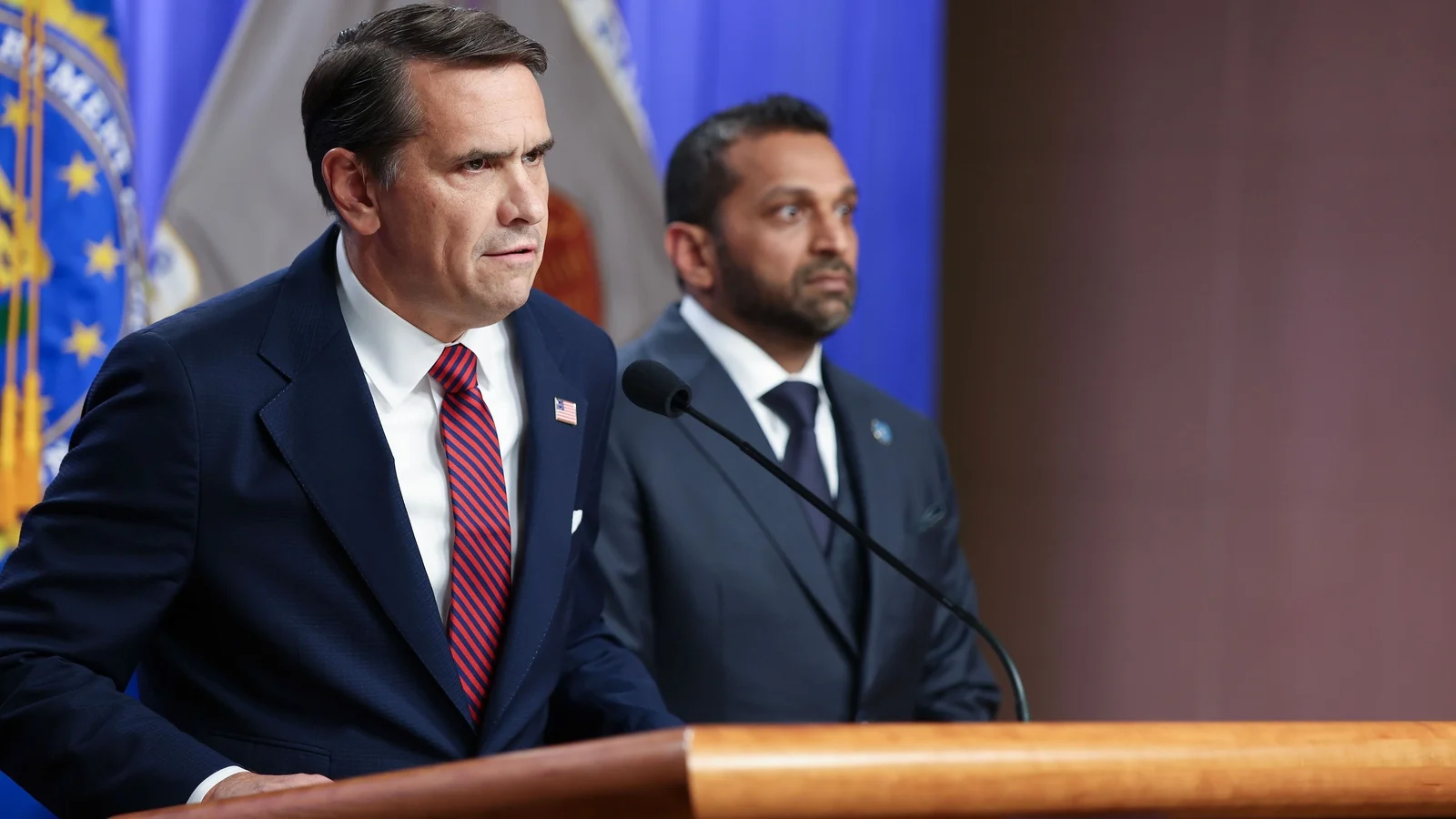 Acting Attorney General Todd Blanche and FBI Director Kash Patel at a press conference to announce charges against former FBI Director James Comey