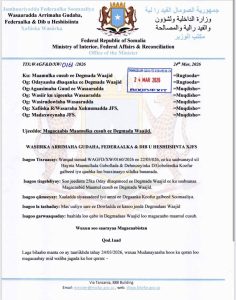 Mar 24(Jowhar)-Dawladda Faderaalka Soomaaliya ayaa shaacisay in ay gudoomiye degmo u magacowday degmada Waajid ee gobalka Bakool, xili ay sii xoogeysatay xiisadda dowladda iyo Koofur Galbeer.