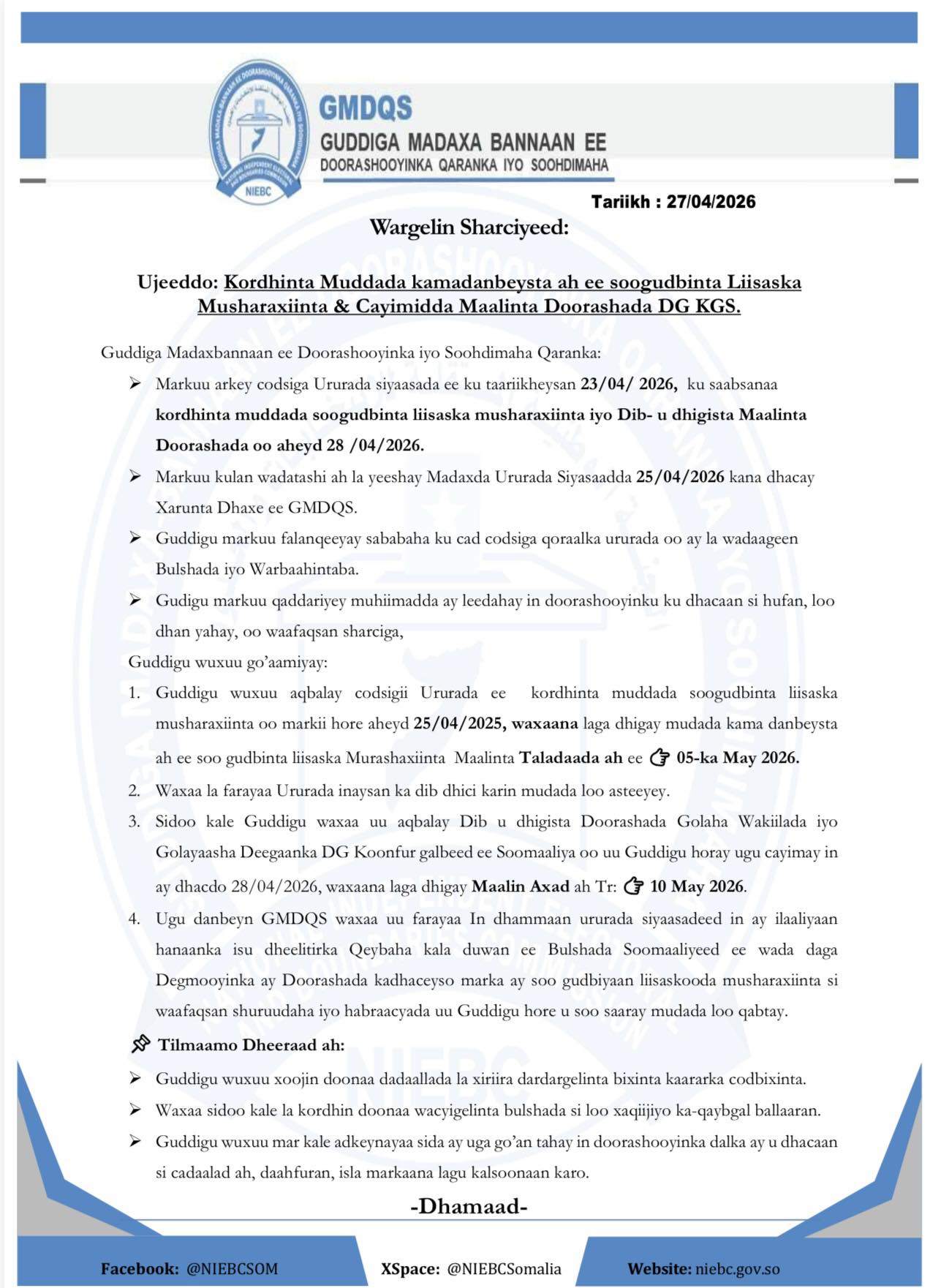Soo gudbinta liisaska musharaxiinta ayaa laga dhigey inay ku eg tahay 5ta bisha May 2026 halka maalinta doorashadana laga dhigey 10ka May 2026.