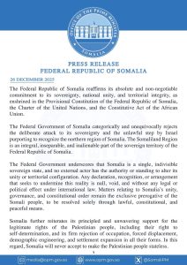 Dec 26(Jowhar)-Dowladda Soomaaliya oo goordhow war-saxaafadeed kasoo saartay Aqoonsiga Isra1l ee Somaliland ayaa si adag u diidday tallaabadan aoo ay ku sheegtay mid sharci-darro ah oo lagu waxyeelleynayo madax-bannaanida Soomaaliya, iyadoo caddeysay in Somaliland ay tahay qayb aan ka go’i karin Jamhuuriyadda Federaalka Soomaaliya.