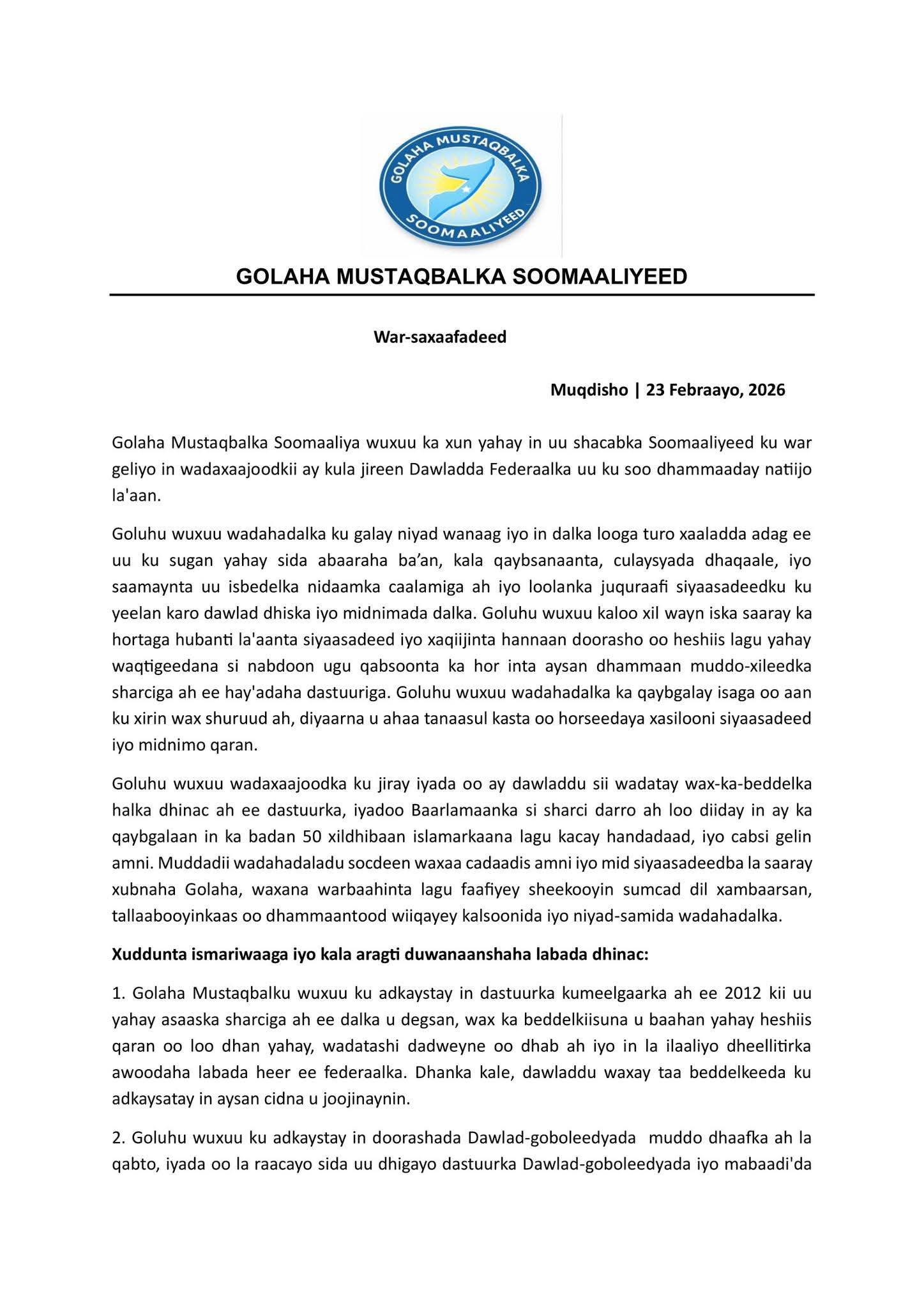 Halkan hoose ka aqriso war saxaafadeedka ka soo baxay golaha mustaqbalka.