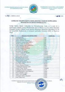 Mar 28(Jowhar)-Guddiga Doorashooyinka Koonfur Galbeed ayaa kudhawaaqay liiska mudanayaasha baarlamaanka cusub.