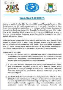 Nov 12(Jowhar)-Golaha Mustaqbalka Soomaaliyeed oo ay ku mideysan yihiin Madasha Samatabixinta, Jubaland iyo Puntland ayaa war-saxaafadeed kasoo saaray shir saddex maalmood uga socday magaalada Nairobi.