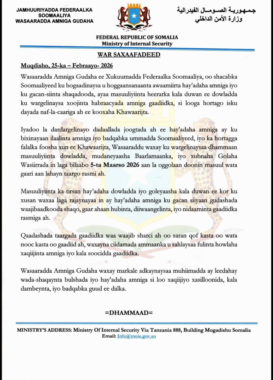 Qoraal ka soo baxay Wasaaradda Amniga Gudaha ee Xukuumadda Federaalka Soomaaliya, ayaa lagu sheegay in talaabadan ay tahay mid lagu dardargelinayo dadaallada joogtada ah ee hay’adaha amniga ay ku bixinayaan ilaalinta amniga, bad-qabka ummadda, iyo ka hortagga falalka foosha xun ee Khawaarijta,