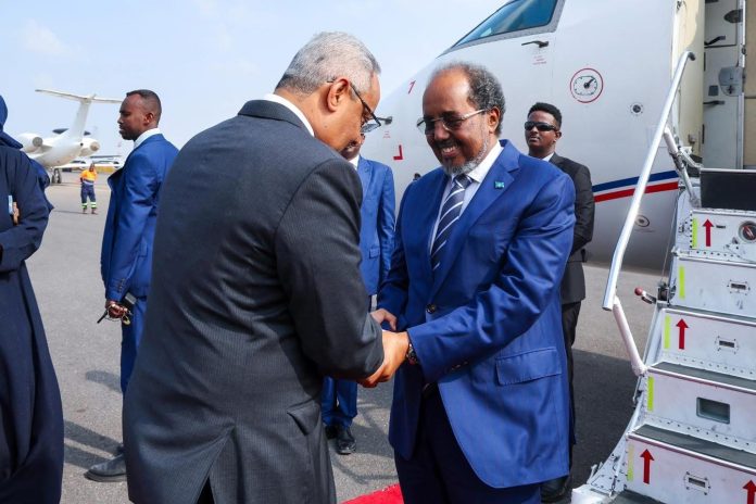 Mar 11(Jowhar)-Madaxweynaha Jamhuuriyadda Federaalka Soomaaliya Mudane Xasan Sheekh Maxamuud iyo wafdi uu hoggaaminayo ayaa gaaray magaalada Jabuuti ee Caasimadda dalka aan walaalaha nahay ee Jamhuuriyadda Jabuuti, halkaasi oo si diiran loogu soo dhoweeyay.