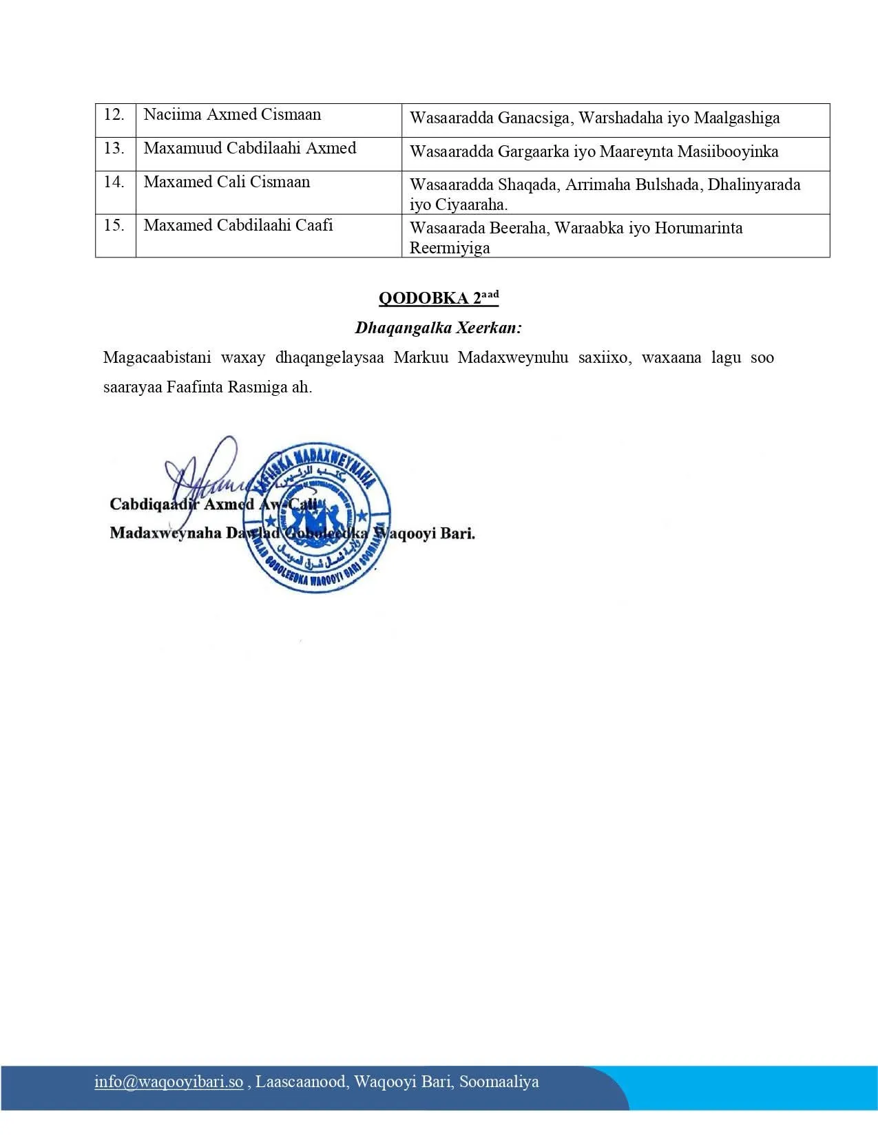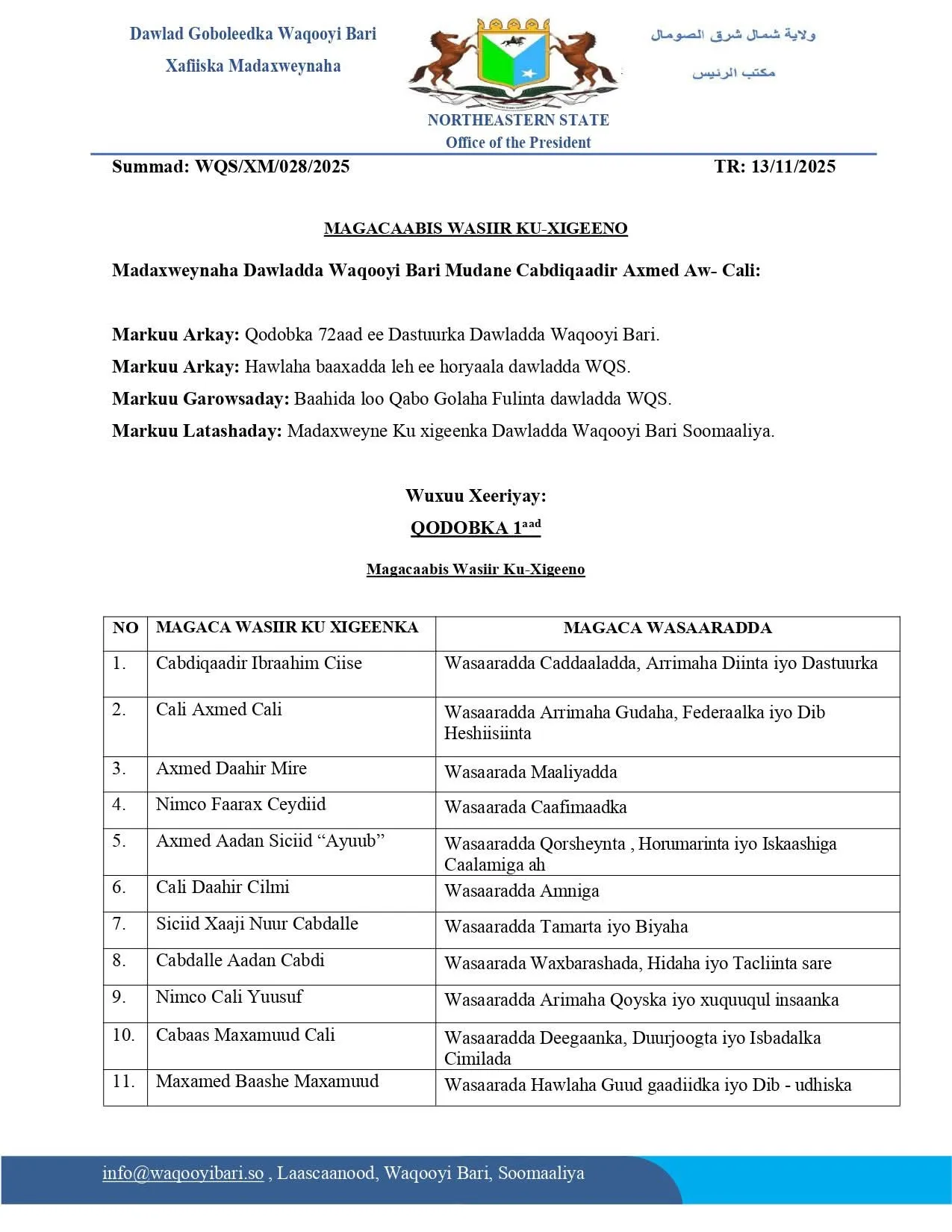 Nov 14(Jowhar)-Madaxweynaha Maamulka Waqooyi Bari Cabdiqaadir Axmed Aw Cali (Firdhiye) ayaa magacaabay 15 wasiir ku-xigeen oo ka mid noqonaya Golaha Wasiirada xukuumaddiisa.