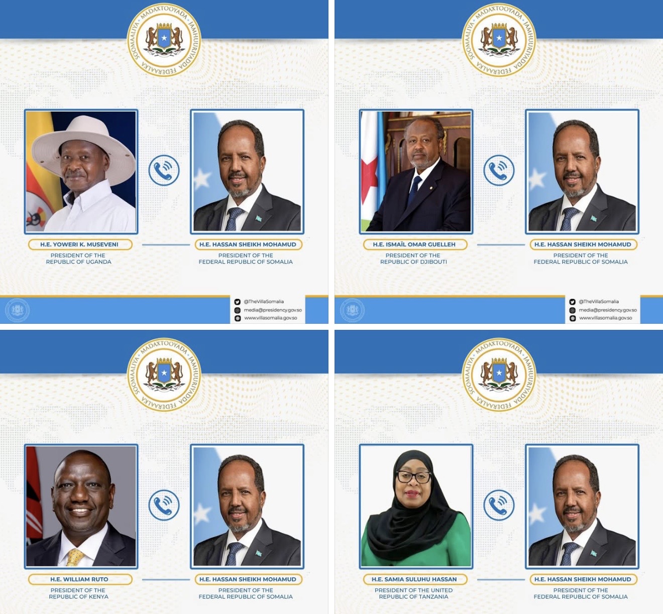 Madaxweynaha Jamhuuriyadda Jabuuti ahna Guddoomiyaha IGAD Mudane Ismaaciil Cumar Geelle Madaxweynaha Jamhuuriyadda Kenya ahna hoggaamiyaha Dalladda Bulshada Bariga Afrika (EAC) Mudane William Ruto, Madaxweynaha Jamhuuriyadda Midowday ee Tanzania Marwo Samia Suluhu Hassan, iyo Madaxweynaha Jamhuuriyadda Uganda Mudane Yoweri Museveni.