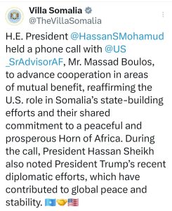 Nov 27(Jowhar)-Madaxweynaha Soomaaliya Xasan Sheekh Maxamuud ayaa khadka taleefanka kula hadlay Mr. Massad Boulos, oo ah la-taliyaha sare ee arrimaha Afrika ee dowladda Maraykanka.
