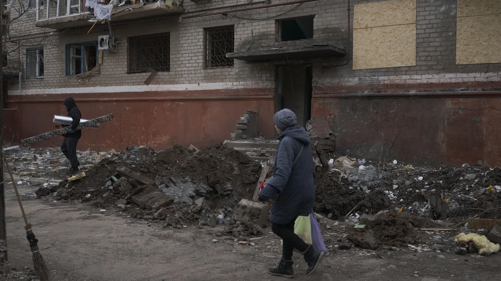 A man walks past a building damaged in a Russian drone attack in Kramatorsk, Ukraine on Tuesday