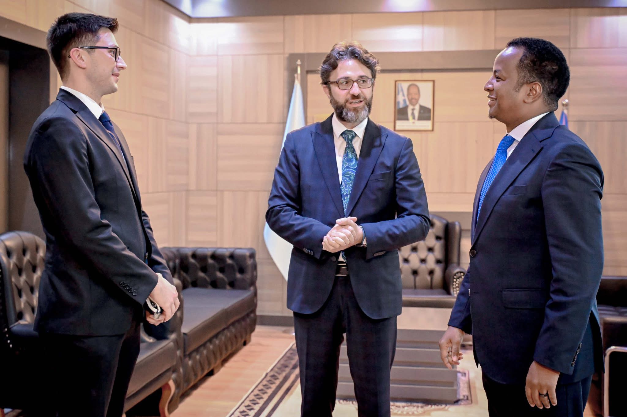 Nov 24(Jowhar)-Wasiirka Arrimaha Dibadda iyo Iskaashiga Caalamiga ah ee Jamhuuriyadda Federaalka Soomaaliya, Mudane Cabdisalaan Cabdi Cali, ayaa maanta xafiiskiisa ku qaabilay Safiirka Dowladda Turkiga ee Soomaaliya, Ambassador Alper Aktas.