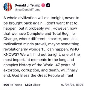 Apr 07(Jowhar)-Donald Trump ayaa sheegay in xaalad halis ah ay caawa ka dhici karto Iran, isagoo ka digay in “ilbaxnimo dhan ay baabi’i karto caawa”.