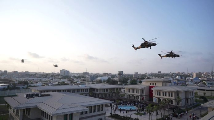 Wasaaradda gaashaandhiga Turkey ayaa sheegtay in Xaflad lagu qabtay gudaha safaaradda Turkey ee Muqdisho ay ka qayb qaateen “Diyaaradaha Turkey ee T129 ATAK iyagoo salaamaayay ka qaybgalayaasha xaflada.
