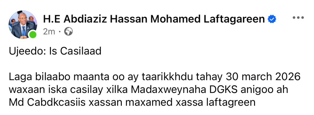 Mar 30(Jowhar)- Madaxweynihii Dowlad Goboleedka Koofur Galbeed Soomaaliya Cabdicasiis Xasan Maxamed ayaa qoraal uu soo dhigey bartiisa Facebook ku sheegay inuu iska casilay xilka Madaxweynaha DKGS.