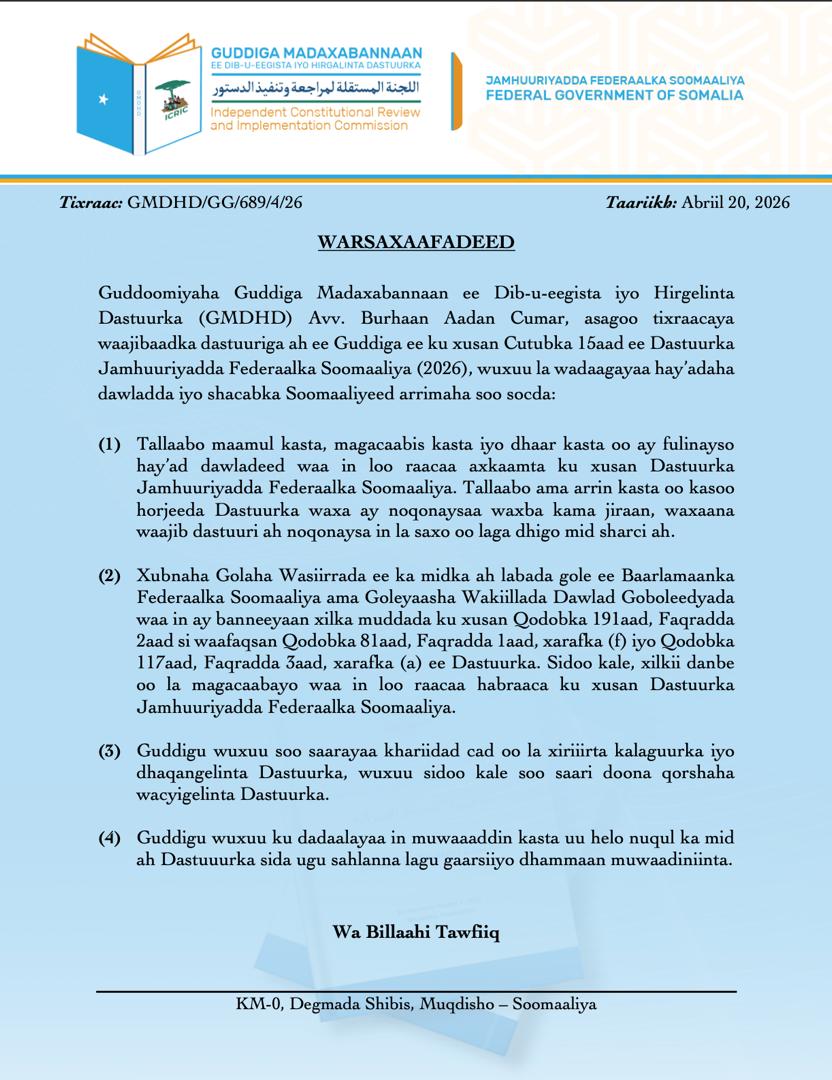 Apr 20(Jowhar) Guddoomiyaha Guddiga Madaxabannaan ee Dib-u-eegista iyo Hirgelinta Dastuurka (GMDHD) Avv. Burhaan Aadan Cumar, asagoo tixraacaya waajibaadka dastuuriga ah ee Guddiga ee ku xusan Cutubka 15aad ee Dastuurka Jamhuuriyadda Federaalka Soomaaliya (2026), wuxuu la wadaagayaa hay’adaha dawladda iyo shacabka Soomaaliyeed arrimaha soo socda: