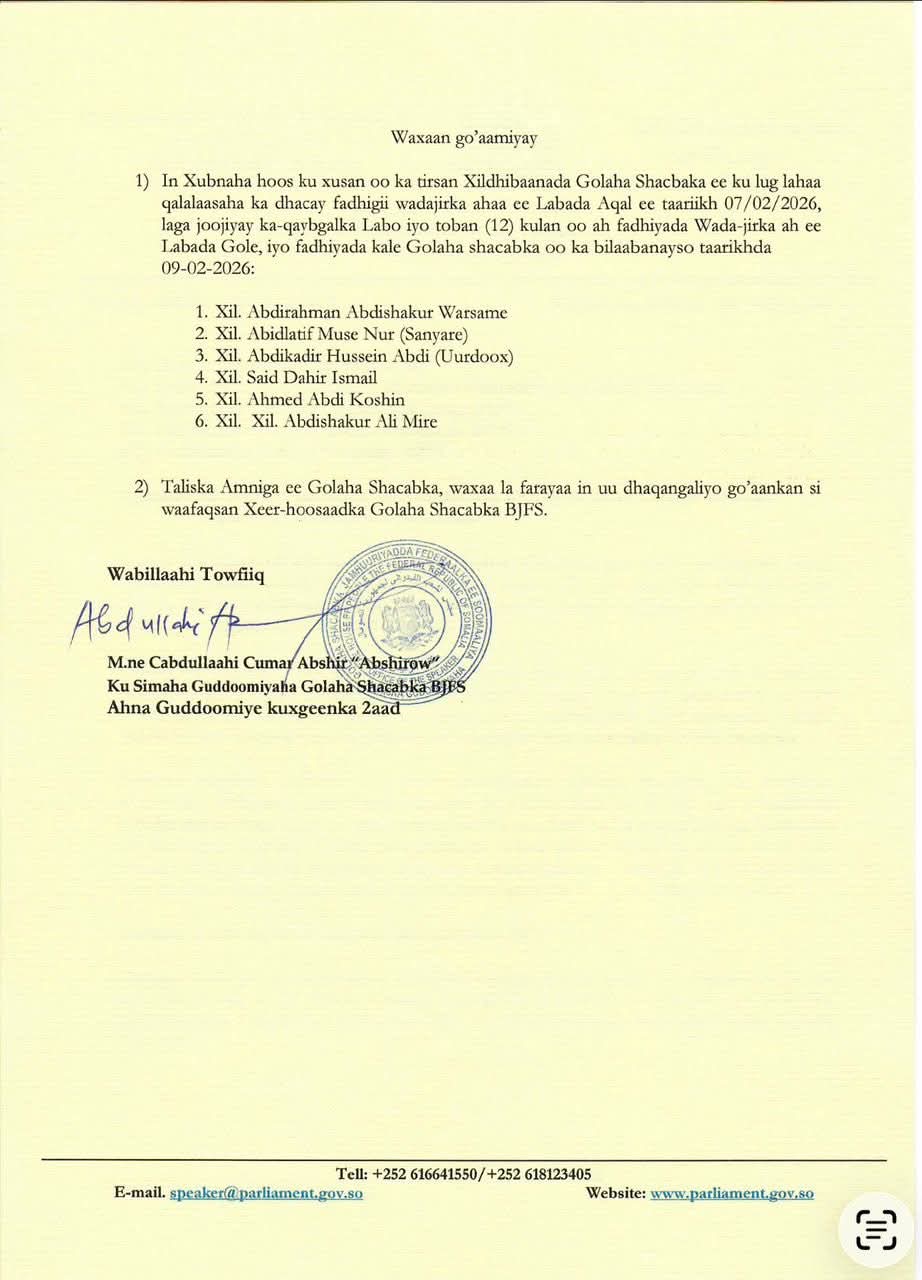 Feb 08 (Jowhar)-Kusimaha Guddoomiyaha Ahna Guddoomiye kuxigeenka labaad ee Golaha Shacabka Baarlamaanka BJFS Mudane Cabdullaahi Cumar Abshirow ayaa soo saaray go’aan rasmi ah oo la xiriira ka joojinta fadhiyada guud ee wadajirka ah ee labada Aqal ee Baarlamaanka Dalka iyo sidoo kale fadhiyada Golaha Shacabka.